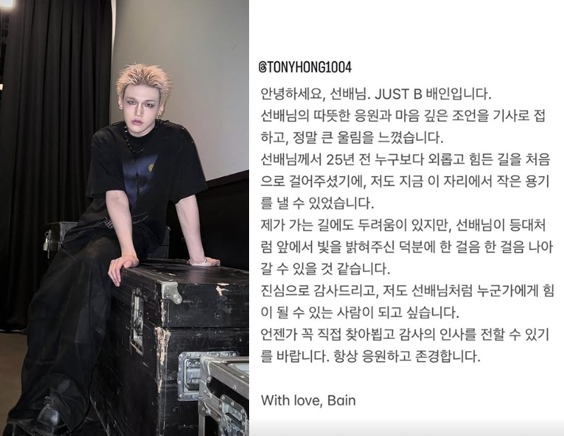 메시지에는 배인이 홍석천에게 "안녕하세요 선배님. 저스트비 배인입니다. 선배님의 따뜻한 응원과 마음 깊은 조언을 기사로 접하고 정말 큰 울림을 느꼈습니다. 선배님께서 25년 전 누구보다 외롭고 힘든 길을 처음으로 걸어주셨기에 저도 지금 이 자리에서 작은 용기를 낼 수 있었습니다"라고 적혀 있다.