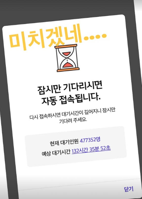 공개된 사진에는 SK텔레콤 모바일 홈페이지인 T월드 접속 화면이 담겼다. 하지만 홈페이지 접속 대기 인원이 약 47만명, 예상 대기 시간이 약 132시간으로 공지돼 있다.