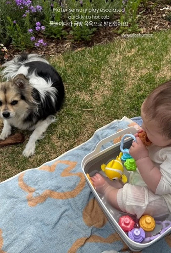 공개된 사진 속에는 빈지노의 아들과 반려견의 투 샷이 담겼다. 그의 아들은 물이 담긴 통에 들어가 장난감을 가지고 놀고 있다. 살짝 보인 아기의 비주얼이 귀여움을 자아낸다.
