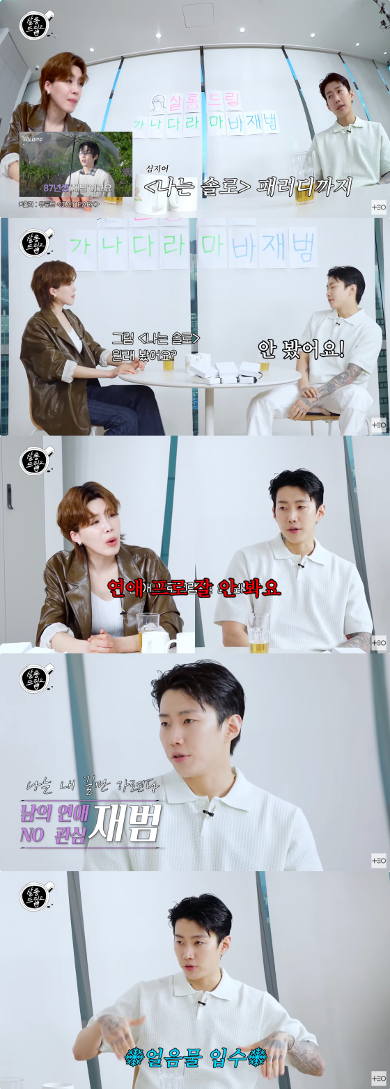 박재범이 "원래 연애 프로그램을 잘 안 본다. 관심이 없다"고 답하자 장도연은 "남의 연애에 관심이 없냐"고 거듭 질문했다.