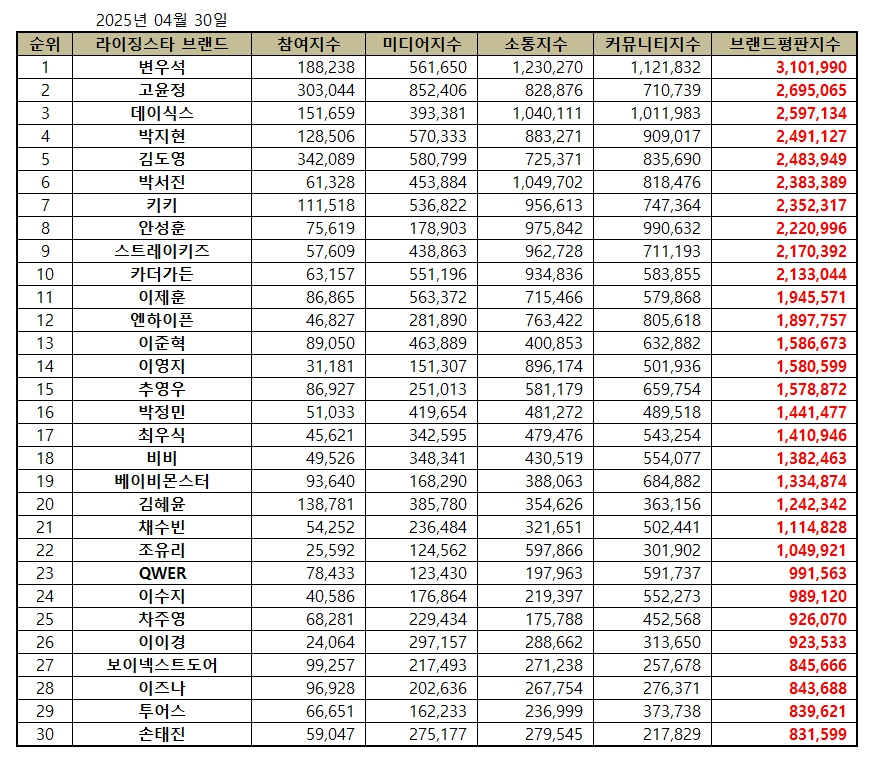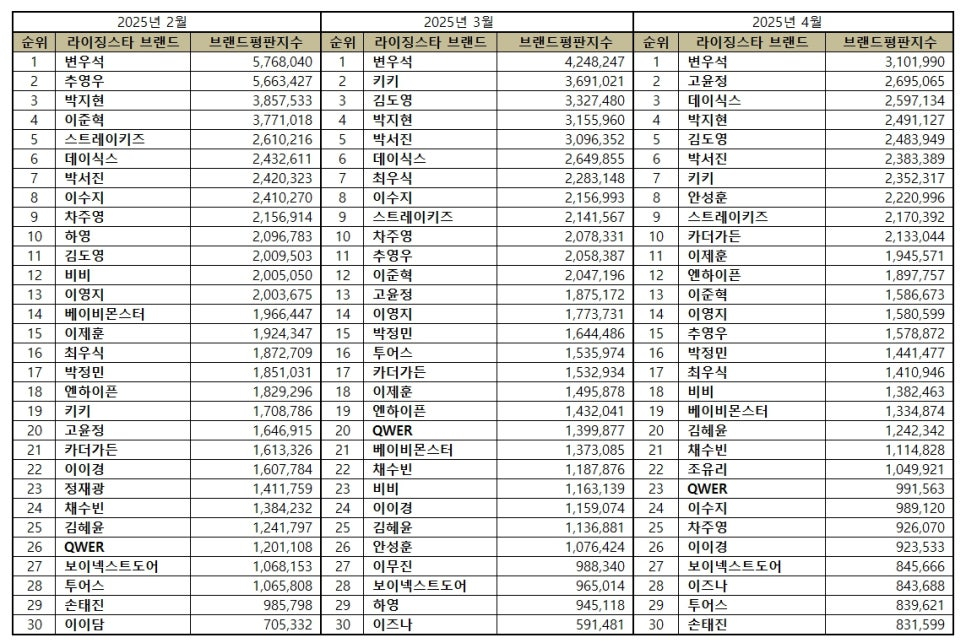 2025년 4월 라이징 스타 브랜드평판 30위 순위는 변우석, 고윤정, 데이식스, 박지현, 김도영, 박서진, 키키, 안성훈, 스트레이키즈, 카더가든, 이제훈, 엔하이픈, 이준혁, 이영지, 추영우, 박정민, 최우식, 비비, 베이비몬스터, 김혜윤, 채수빈, 조유리, QWER, 이수지, 차주영, 이이경, 보이넥스트도어, 이즈나, 투어스, 손태진 순으로 분석됐다.