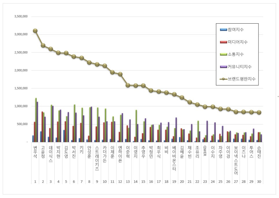 라이징 스타 브랜드평판 1위를 기록한 변우석 브랜드는 참여지수 188,238 미디어지수 561,650 소통지수 1,230,270 커뮤니티지수 1,121,832가 되면서 브랜드평판지수 3,101,990으로 분석됐다.