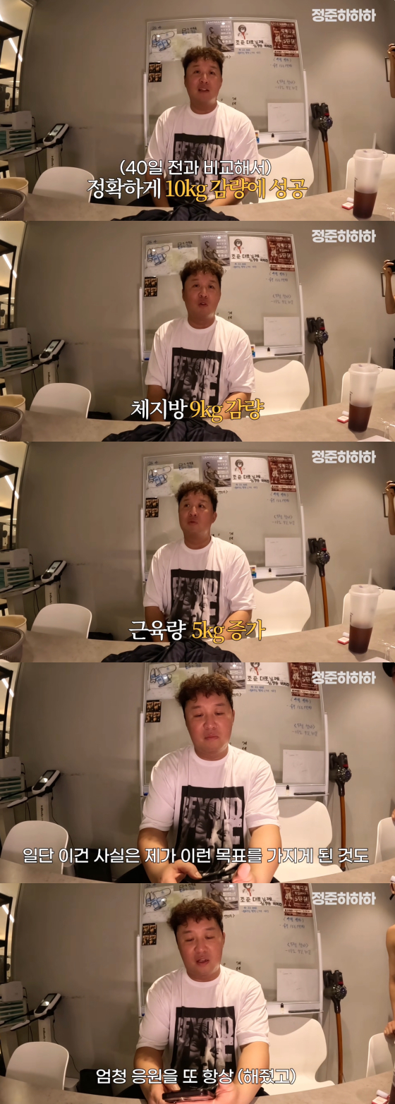 영상에서 정준하는 지난 40일 간 운동 병행 다이어트를 진행한 결과 총 10kg을 감량해 놀라움을 자아냈다.
