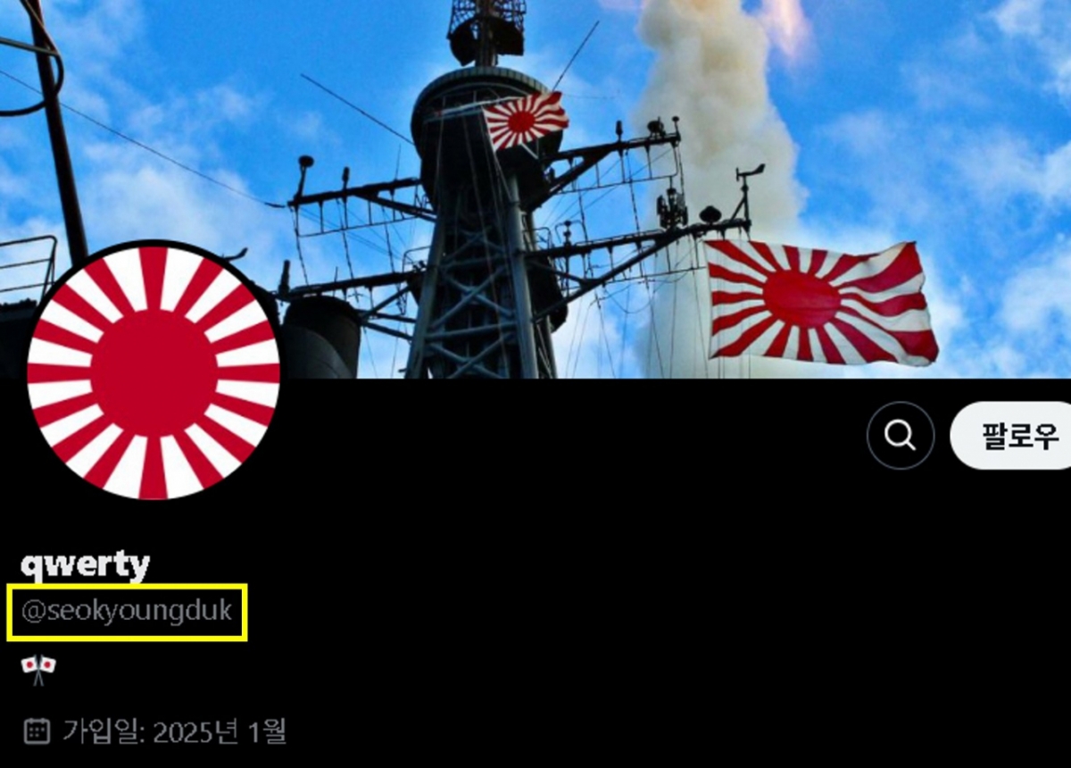 X(옛 트위터) 계정에 'seokyoungduk'으로 아이디를 만들고, 프로필 사진 등에 일본 욱일기를 내걸었다.