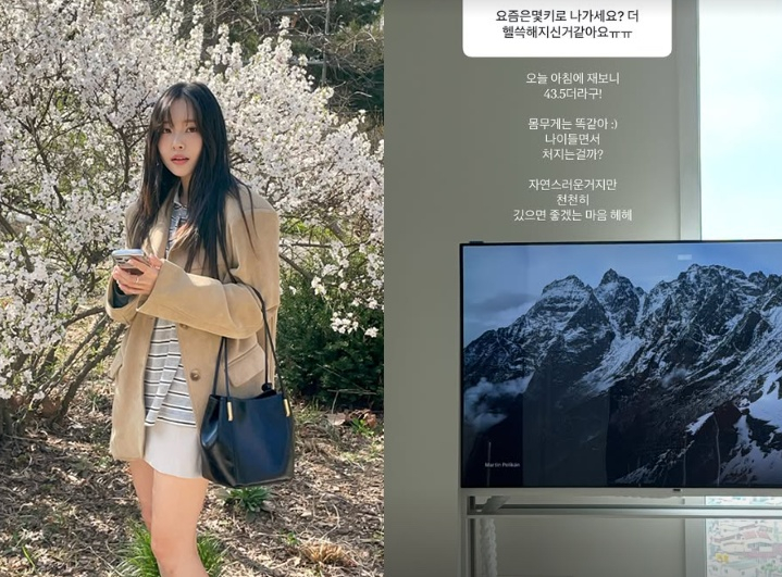 이솔이는 자신의 몸무게에 대한 질문에 "오늘 아침에 재보니 43.5kg"이라며 "몸무게는 똑같아. 나이 들면서 처지는 걸까? 자연스러운 거지만 천천히 갔으면 좋겠는 마음"이라고 답했다.