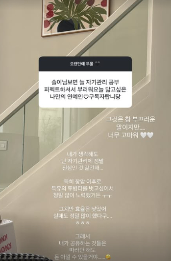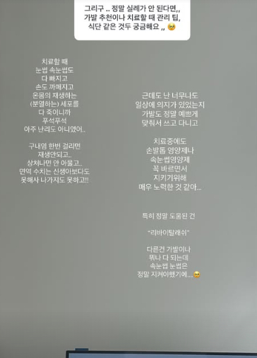 또한 이솔이는 "내가 생각해도 난 자기관리에 진심인 것 같긴 해. 특히 항암 이후로 특유의 투병 티를 벗고 싶어서 정말 많이 노력했거든. 그치만 효율은 낮았어. 실패도 정말 많이 했다구"라며 "치료할 때 눈썹 속눈썹도 다 빠지고 손도 까매지고 온몸의 재생하는(분열하는) 세포들 다 죽이니까 푸석푸석 난리도 아니었어. 구내염 한번 걸리면 재생 안되고 상처나면 안 아물고 면역 수치는 신생아보다도 못해서 나가지도 못하고"라고 토로했다.