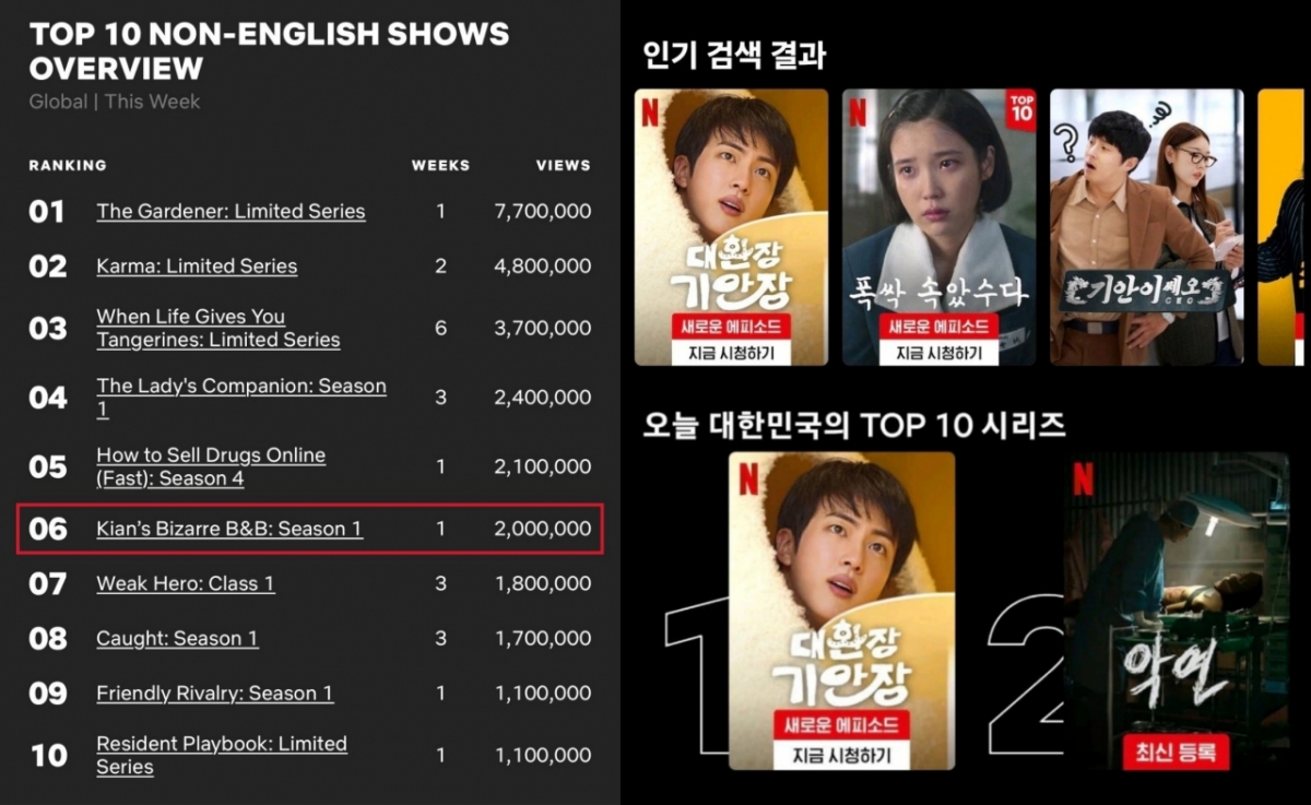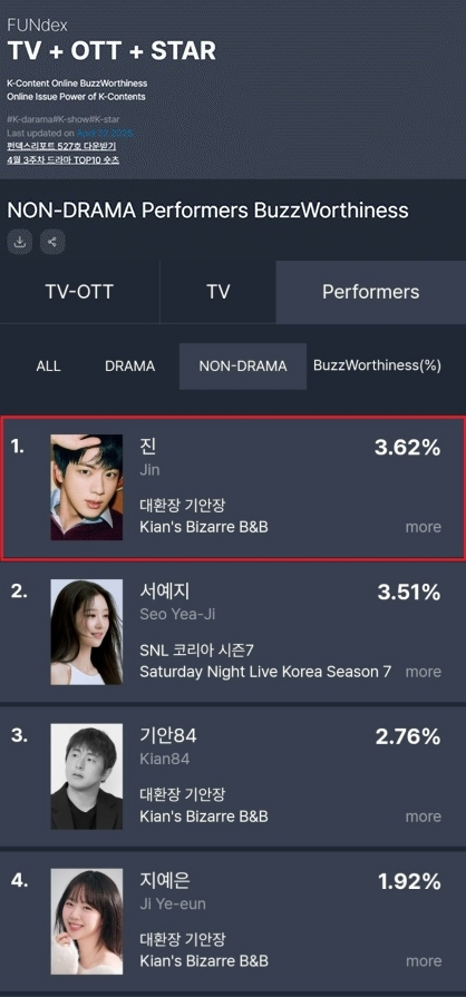 한편 최근 공개된 진의 첫 넷플릭스(Netflix) 오리지널 데뷔작 '대환장 기안장'이 넷플릭스 1위를 차지하고, 넷플릭스 한국 오리지널 예능 가운데 리얼리티 서바이벌 콘텐츠가 아닌 버라이어티 콘텐츠로서 최초로 글로벌 차트에 진입했다. 진은 TV-OTT 통합 비드라마 출연자 화제성 1위에 오르며 폭발적인 인기와 화제성을 증명했다.