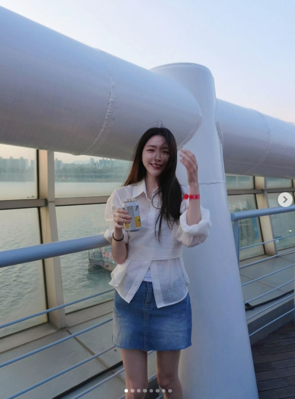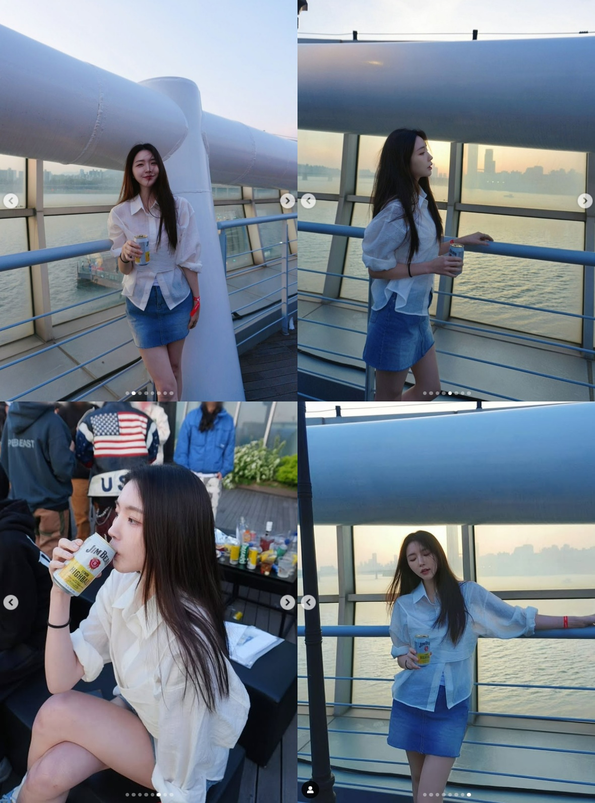 사진 속 성해은은 한 주류 브랜드와 컬래버레이션을 진행, 노을이 지고 있는 한강에서 하이볼을 한 잔 마시고 있는 모습. 그는 화이트 셔츠에 짧은 청치마를 매치하면서 남다른 패션 센스를 완성했다.