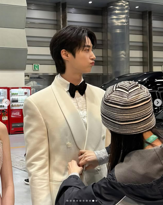 사진 속 변우석은 지난 5일 코엑스에서 열린 제61회 백상예술대상 참석 전 의상을 점검하고 있는 모습. 그는 주차장에서 옷매무새를 가다듬고 있는 스태프와 함께 훈훈한 비주얼을 자랑했다.