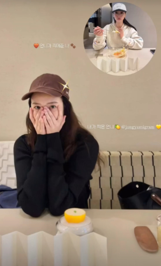 또한 "언니가 찍어준 나"라며 음식을 들고 있는 자신의 모습도 공개해 눈길을 끌었다. 두 사람은 서로 사진을 찍어주며 데이트를 즐긴 것으로 보인다.