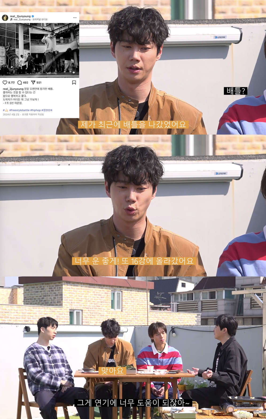 조점석이 "지금까지 살아오면서 가장 영화 같았던 순간이 언제냐"고 묻자, 이준영은 한동안 기억을 더듬다 "최근에 춤 프리스타일 힙합 배틀에 나갔다. 너무 운 좋게 16강에 올라갔다"고 밝혔다.