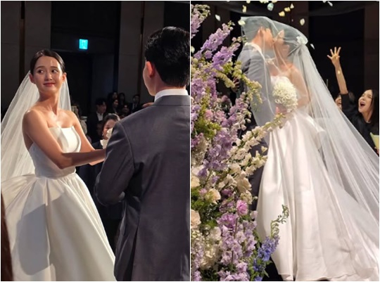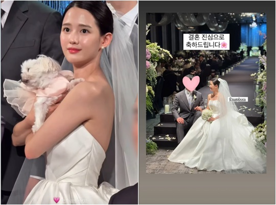 지인들을 통해 공개된 결혼식 사진 속 남보라는 너무나 행복한 모습이다. 김보미는 "울 뽀, 너무 예뻐. 눈물 나네"라고 축하를 건넸다.