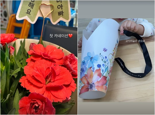 꽃 뒤로는 "엄마 아빠 사랑해요"라고 써있고 나혜미는 감격스러운 듯 "첫 카네이션"이라고 알렸다.