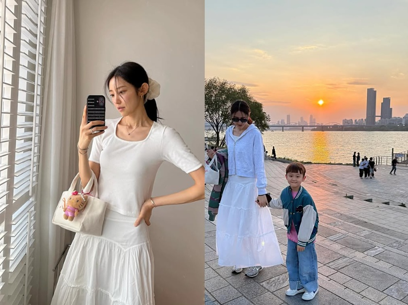 사진 속 서하얀은 아들과 손잡고 한강 인근에서 산책을 하고 있다.
