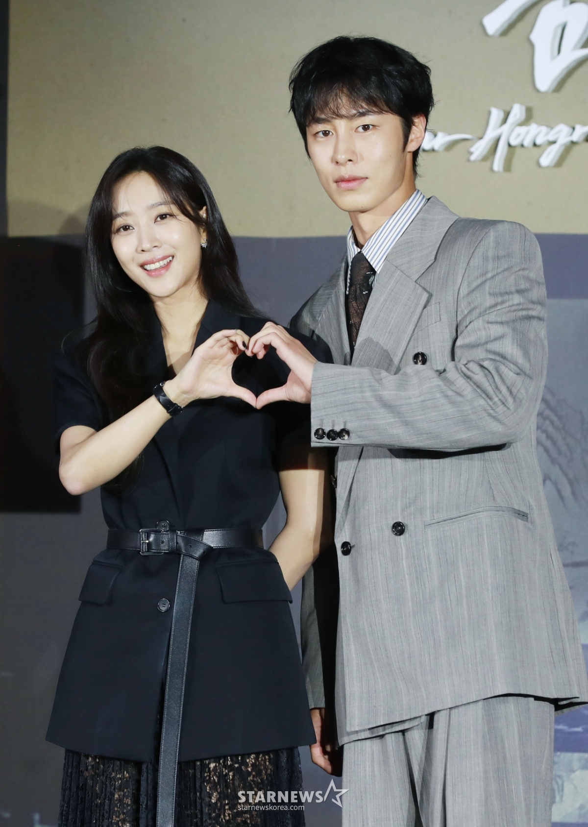 배우 조보아, 이재욱이 13일 오전 서울 신도림 라마다호텔에서 진행된 넷플릭스 오리지널 시리즈 '탄금' 제작발표회에 참석해 포즈를 취하고 있다.
