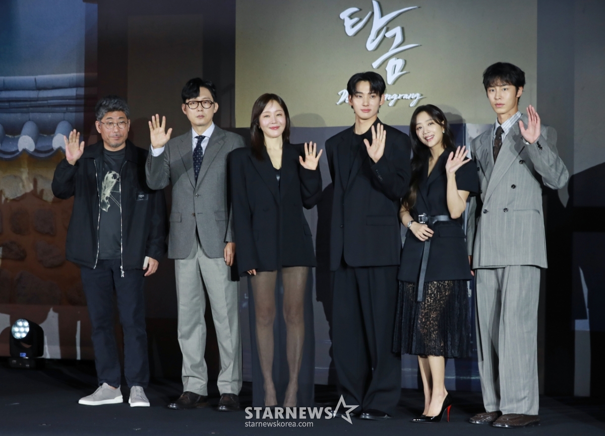 김홍선 감독, 배우 박병은, 엄지원, 정가람, 조보아, 이재욱이 13일 오전 서울 신도림 라마다호텔에서 진행된 넷플릭스 오리지널 시리즈 '탄금' 제작발표회에 참석해 포즈를 취하고 있다.