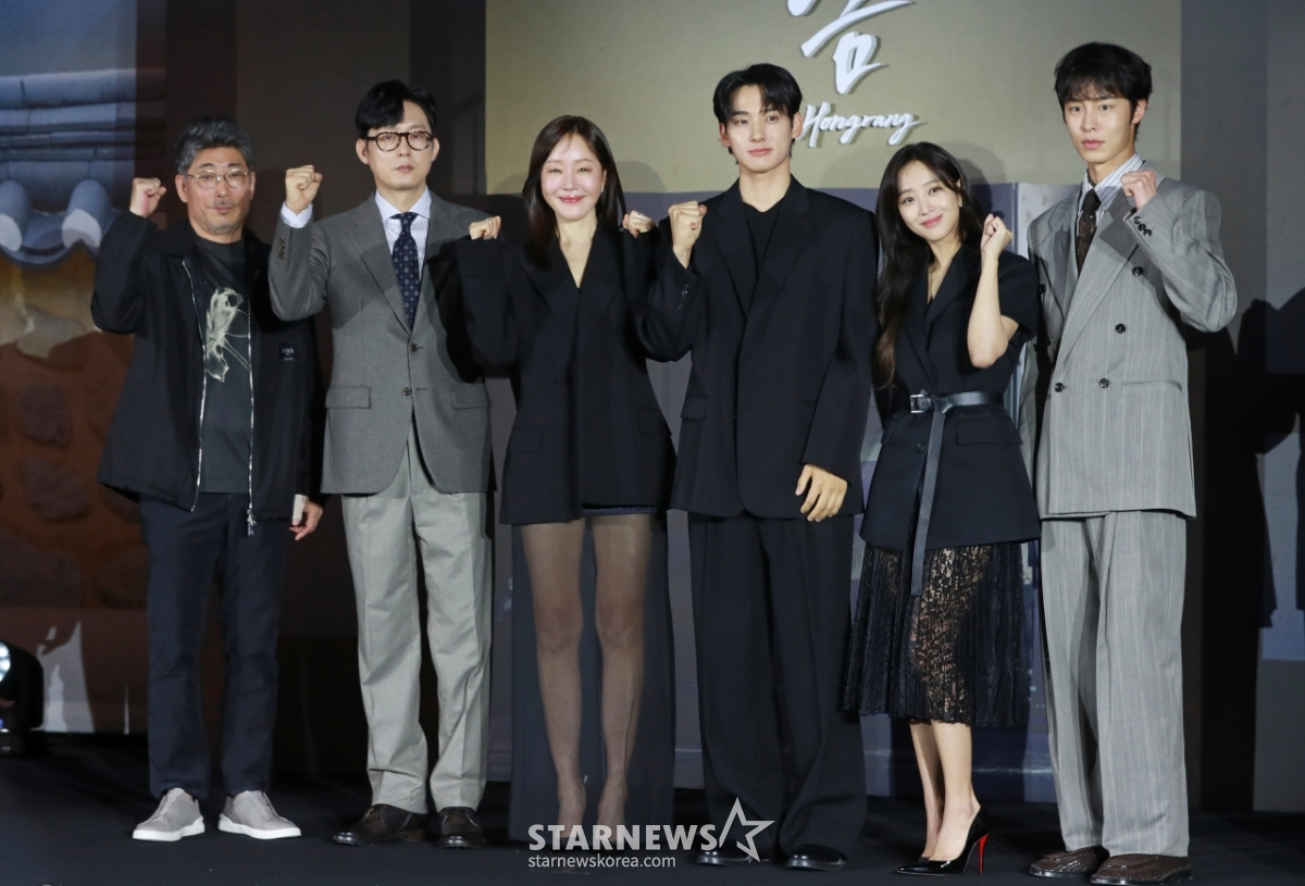 김홍선 감독, 배우 박병은, 엄지원, 정가람, 조보아, 이재욱이 13일 오전 서울 신도림 라마다호텔에서 진행된 넷플릭스 오리지널 시리즈 '탄금' 제작발표회에 참석해 포즈를 취하고 있다.