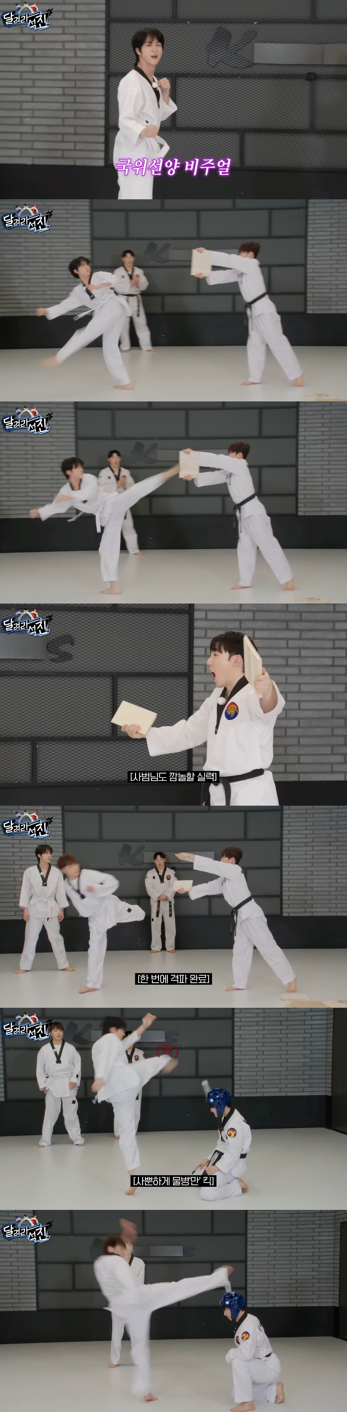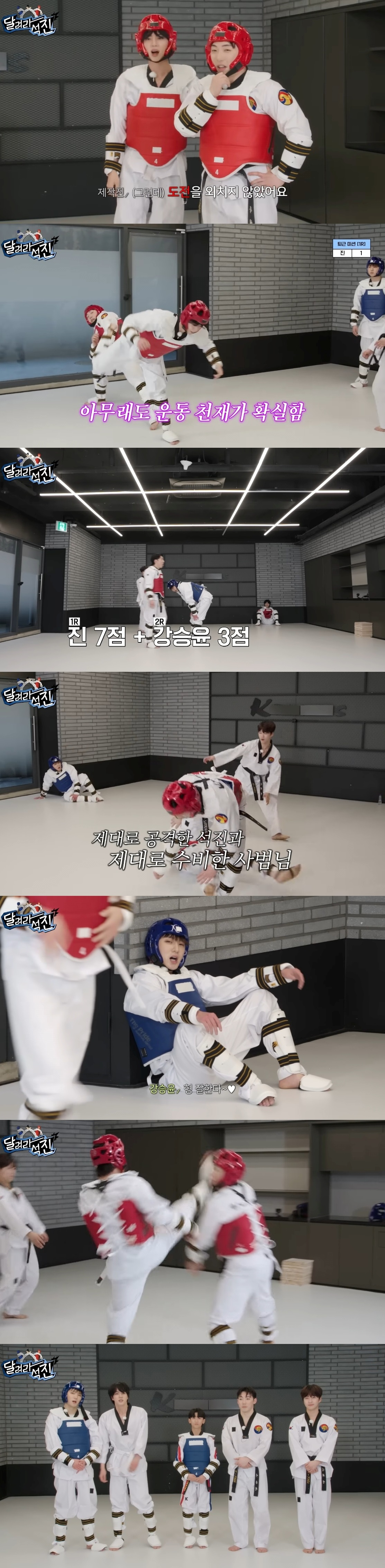 방어 능력 테스트에서 진은 사범의 공격을 다 막는 모습으로 놀라움을 안겼다. 본인까지 놀라는 모습이었다. 뒤후려차기, 턴 차기 등의 발차기 격파 동작 시범을 본 진과 강승윤은 서로 미루는 모습으로 웃음을 줬지만 겸손으로 밝혀졌다. 둘은 모두 칼군무처럼 감탄 나오는 실력으로 성공, 연예계 대표 태권도 실력의 소유자임을 증명했다.