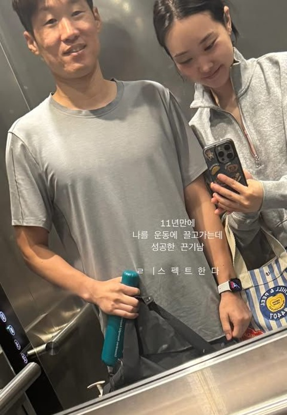아내의 건강을 챙기기 위해 운동을 제안해왔던 것으로 보이는 박지성은 김민지와 함께 행복한 미소를 짓고 있다.