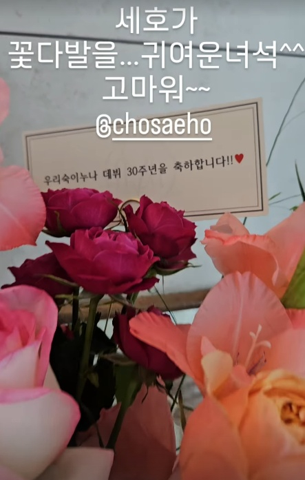 사진 속에는 김숙이 받은 꽃다발 속에 조세호가 쓴 "우리 숙이 누나 데뷔 30주년을 축하합니다!!♥"란 메시지가 적혀 있었다.