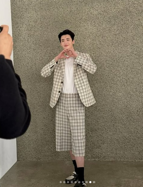 사진 속 이종석은 한 화보 촬영장에서 체크 패턴의 슈트를 입고 손하트 포즈를 취하고 있는 모습. 천진난만한 표정은 물론, 큰 키와 소멸 직전의 소두로 톱모델 못지 않은 비율이 눈길을 끈다.