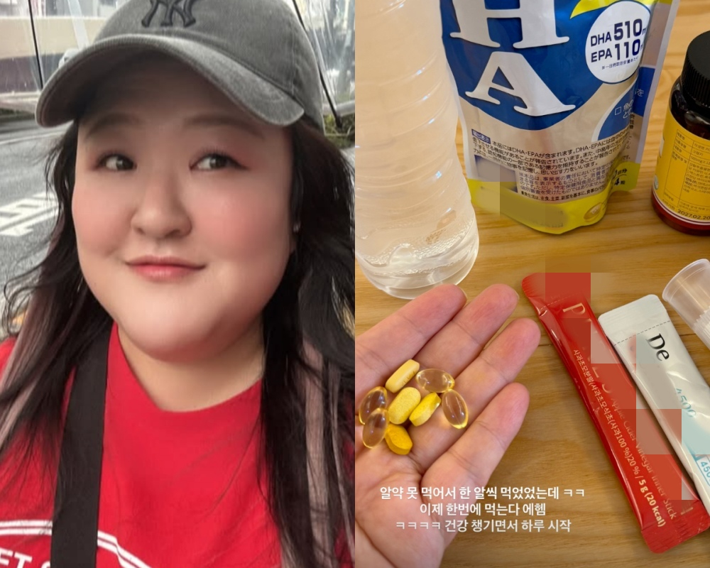 공개된 사진에는 이국주가 챙겨 먹은 유산균, 비타민 등 여러 건강 보조제가 담겨 있다.