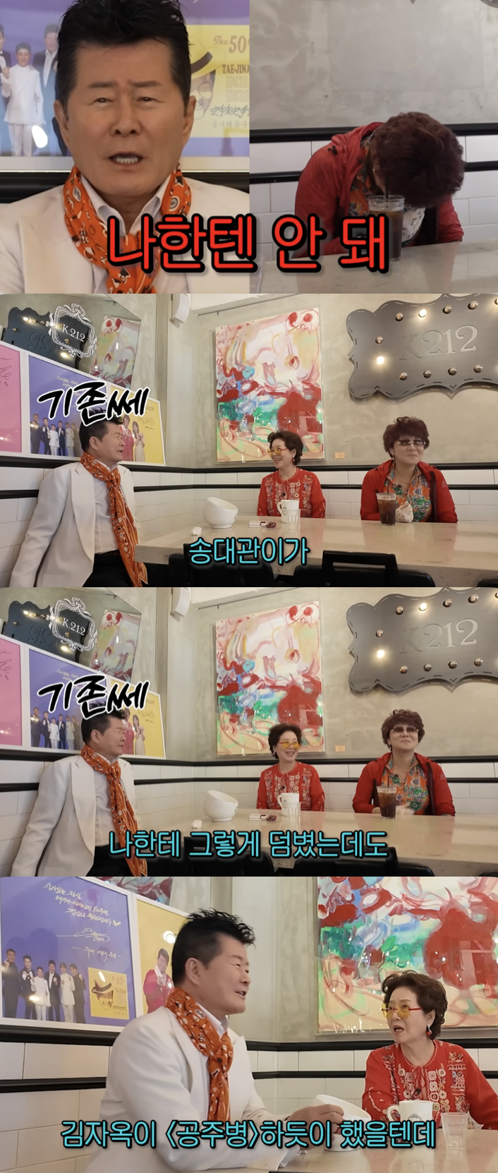 이날 선우용여는 지인이 운영하는 곳이라며 랄랄을 트로트 가수 태진아의 카페로 데려갔다. 부캐 이명화 분장을 한 랄랄의 모습을 본 태진아는 "캐릭터가 대단하다. 그런데 쎄지만 나한텐 안 돼. 난 안 먹어준다"며 웃었다. 이어 "송대관이가 나한테 그렇게 댐볐는데도 안 됐어"라고 덧붙이며, 절친이자 음악적 라이벌이었던 고(故) 송대관을 언급했다.