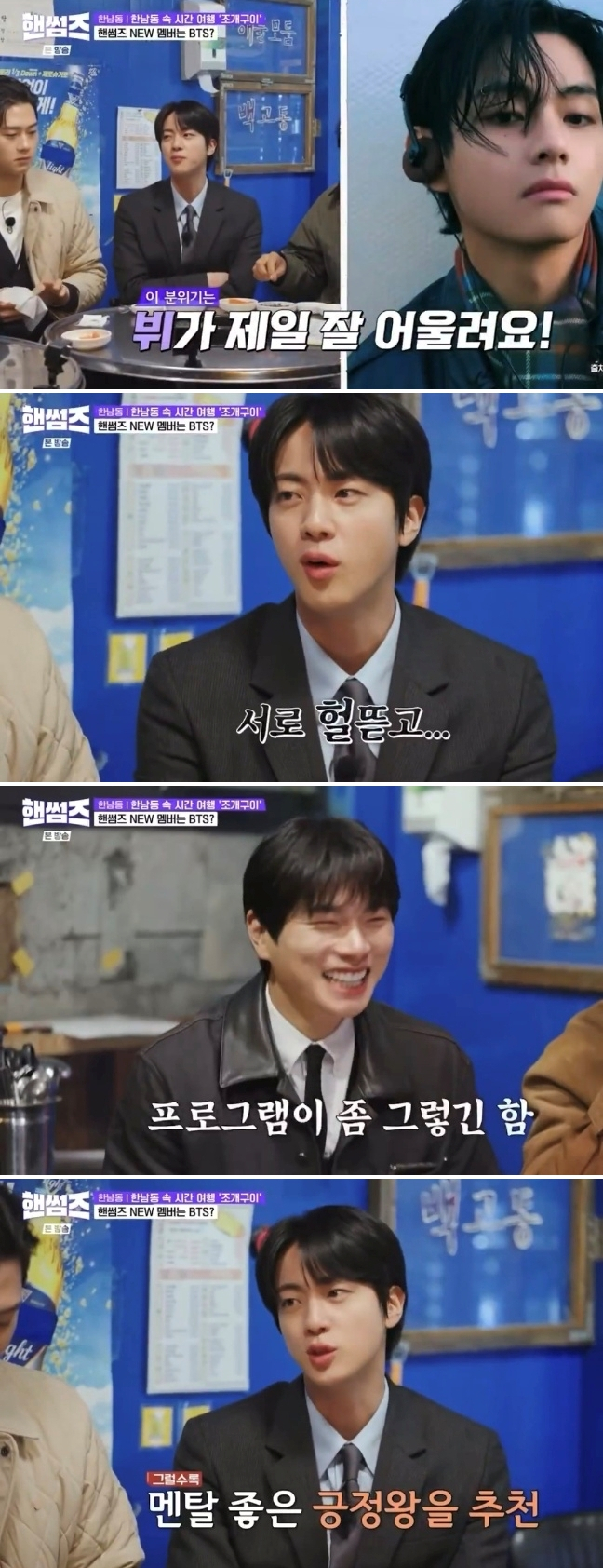 멤버 진은 15일 방송된 tvN '핸썸가이즈'에 출연해 직장인 '점저메추'(점심 저녁 메뉴 추천)를 위한 한남동 맛집 탐방에 나섰다. '핸썸가이즈' 출연자 차태현, 김동현, 이이경, 신승호, 오상욱과 함께 조개구이를 먹는 모습이 그려졌다.