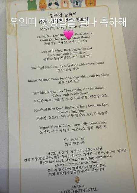 황보라의 절친인 개그우먼 김지민도 돌잔치 참석을 인증했다. 코스요리로 차린 성대한 돌잔치가 눈길을 끈다.