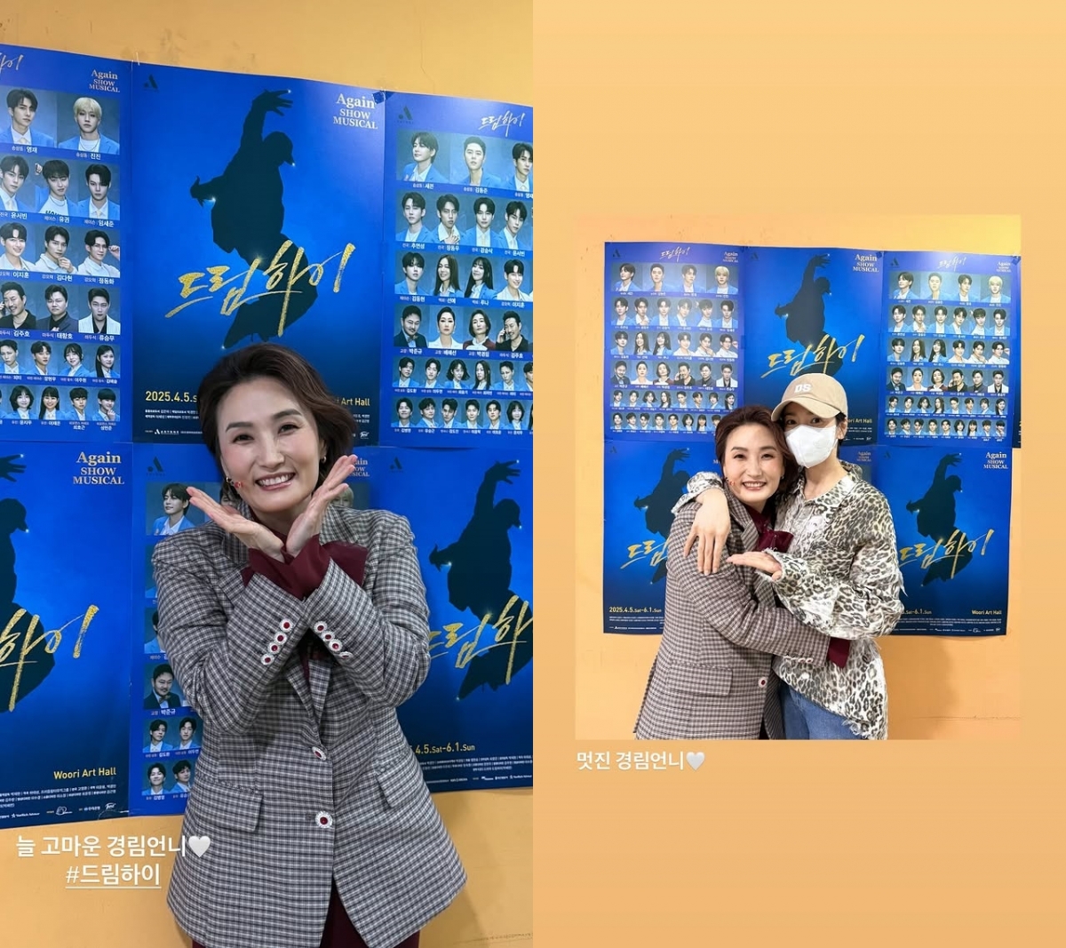 공개된 사진 속에는 쇼뮤지컬 Again '드림하이' 포스터를 배경으로 포즈를 취하고 있는 박경림의 모습이 담겼다. 또 다른 사진에는 "멋진 경림 언니"라는 글과 함께 박경림을 끌어안고 있는 송혜교의 모습이 담겨 눈길을 끈다.