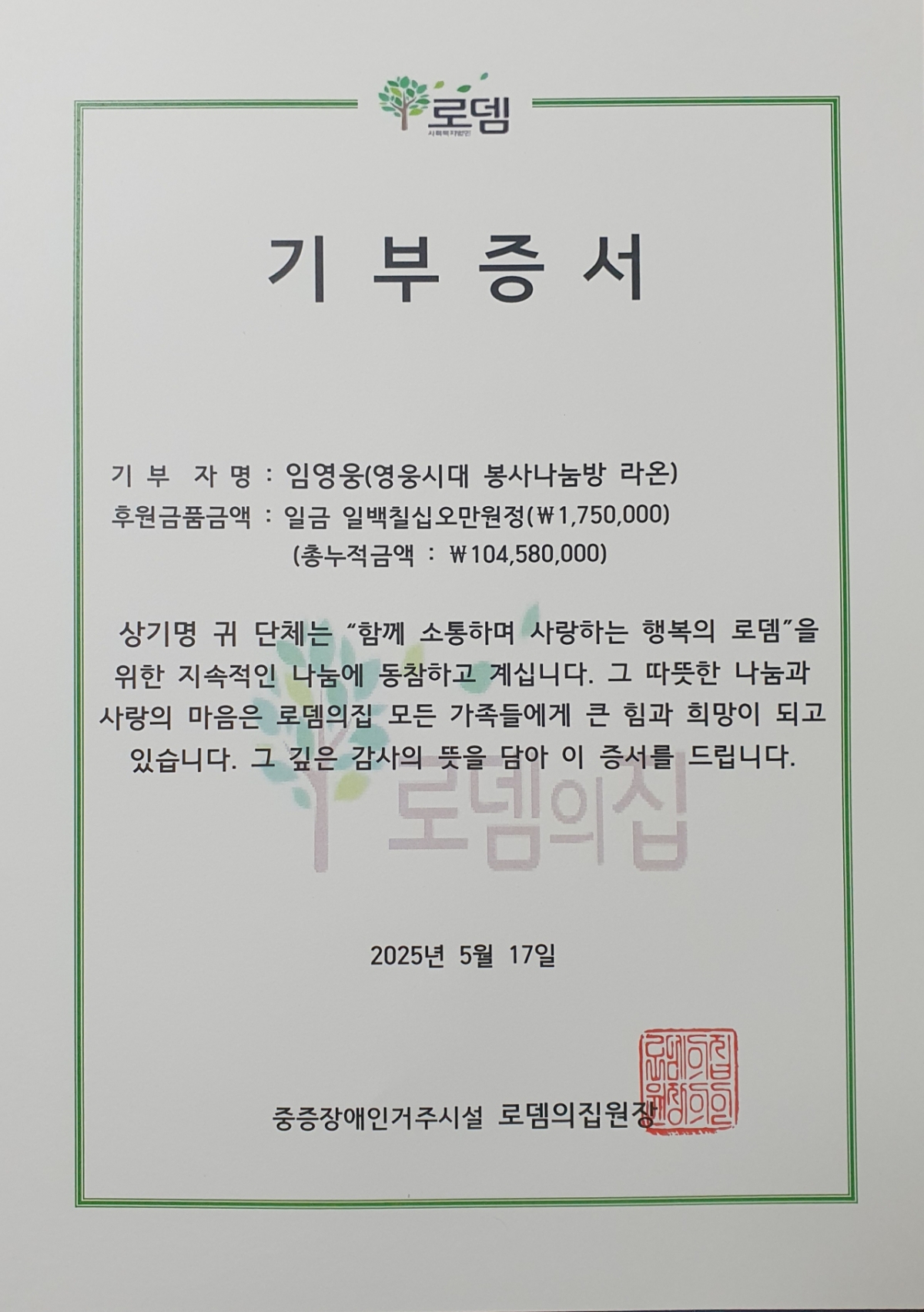 '라온'은 "나눔의 가치를 실천하는 임영웅의 팬으로서 소외된 이웃에게 따뜻한 온기가 되어 주고자 더 꾸준하게 노력하겠다"고 밝혔다.