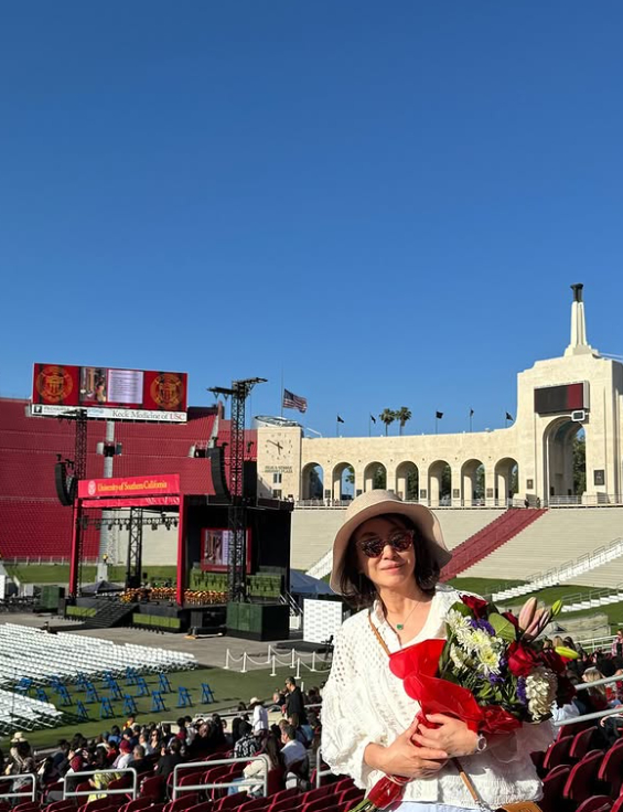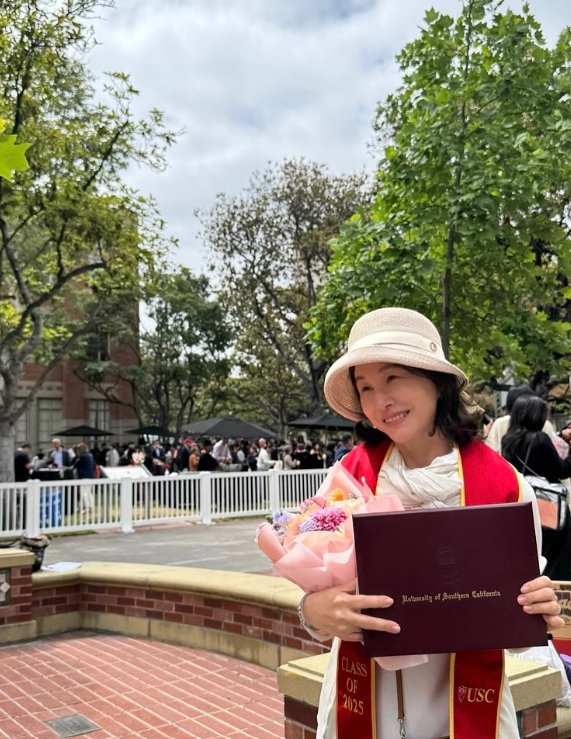 공개된 사진 속에는 둘째 딸의 졸업식 참석을 위해 미국 USC(University of Southern California)에 방문한 김미숙의 모습이 담겨있다. 김미숙은 졸업장과 꽃다발을 들고 미소 짓고 있어 훈훈함을 안긴다.