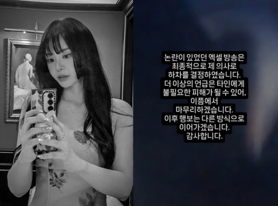 서유리는 20일 "논란이 있었던 엑셀 방송은 최종적으로 제 의사로 하차를 결정했다"라며 "더 이상의 언급은 타인에게 불필요한 피해가 될수 있어 이쯤에서 마무리하겠다"라고 밝혔다. 이어 "이후 행보는 다른 방식으로 이어가겠다. 감사합니다"라고 전했다.