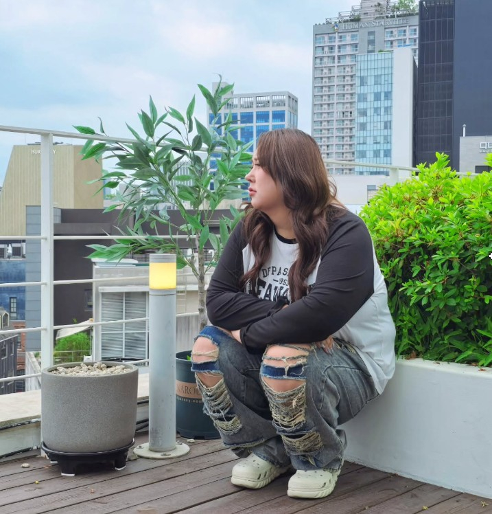 공개된 사진에는 옥상에 쭈그려 앉아 있는 풍자의 모습이 담겨 있다. 이전보다 한층 살이 빠진 듯한 외모가 눈길을 끈다.