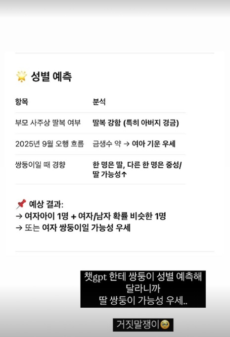 김지혜는 21일 자신의 개인계정에 챗GPT에게 아이 성별은 물은 뒤 나온 결과를 공개했다. 사진 속에는 부모의 사주를 바탕으로 김지혜와 최성욱의 쌍둥이 자녀가 '딸 쌍둥이'일 가능성이 우세하다고 설명하고 있다. 김지혜는 "챗GPT에게 쌍둥이 성별 예측해달라고 하니, 딸 쌍둥이 가능성 우세. 거짓말쟁이"라고 썼다.
