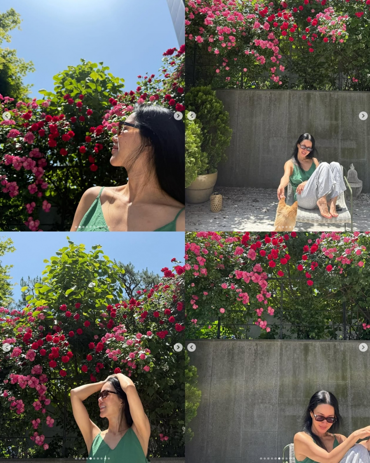 사진 속 엄정화는 자택 테라스에 앉아 한가로운 오후를 즐기고 있는 모습. 반려견과 함께 장미꽃들을 바라보며 따스한 햇살을 느끼고 있다.