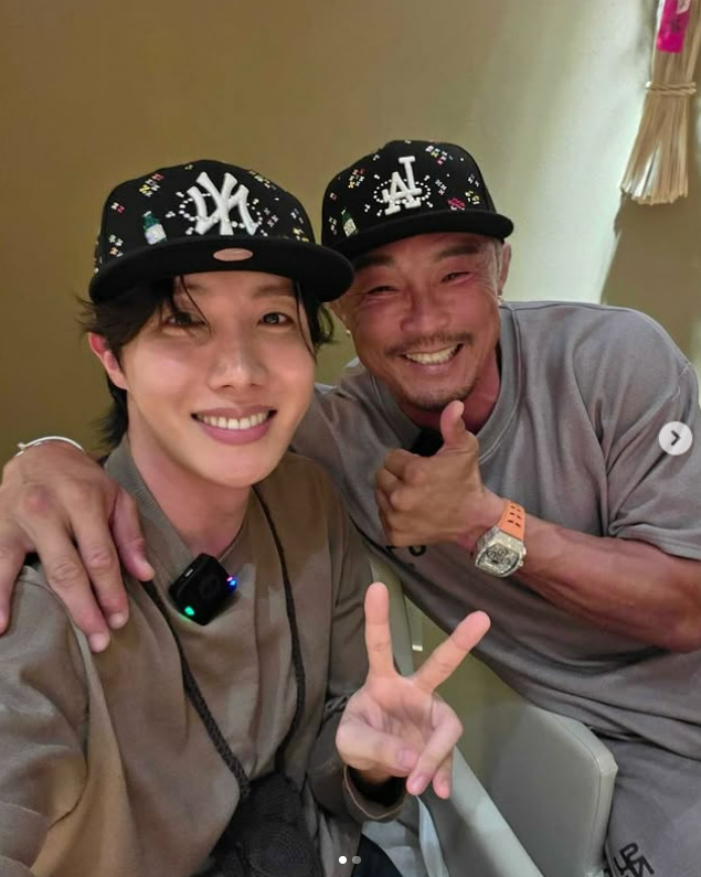 사진 속 추성훈은 제이홉과 어깨동무를 하고 카메라를 향해 엄지를 치켜세우고 있는 모습. 두 사람은 같은 브랜드의 커플 모자를 쓴 채 화기애애한 분위기를 자아내고 있다.