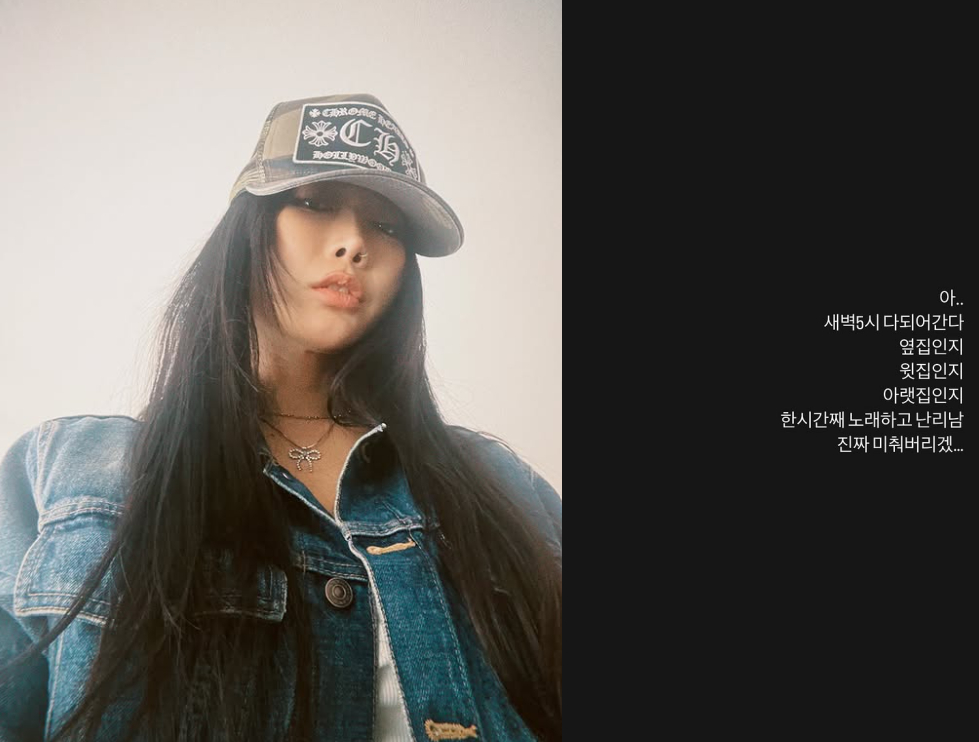 허니제이는 23일 자신의 인스타그램에 "새벽 5시 다 되어간다. 옆집인지 윗집인지 아랫집인지 한 시간째 노래하고 난리남"이라는 글을 올렸다.
