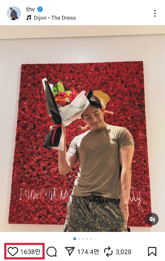 뷔가 지난 2월 23일 인스타그램에 "김병장 생존신고하러 왔습니다.! D-107입니다"라는 글과 함께 여러 장의 사진을 올린 게시물이 2025년 전 세계 인스타그램에서 가장 많은 '좋아요'를 받았다.