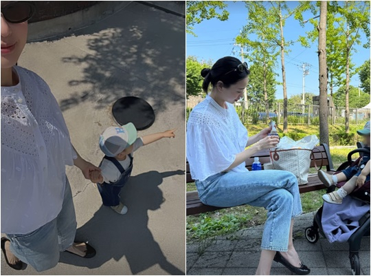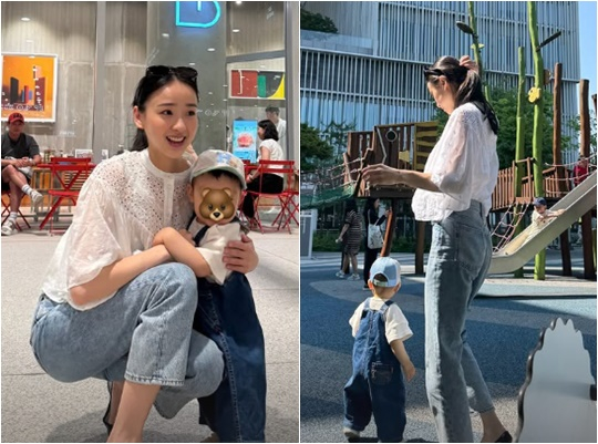 공개된 사진 속 손연재는 화이트 블라우스에 청바지를 입고 아들과 함께 외출에 나섰다. 이제 막 아장아장 걷기 시작한 아들은 청 오버롤즈에 모자를 쓰고 장꾸미를 자랑한다.