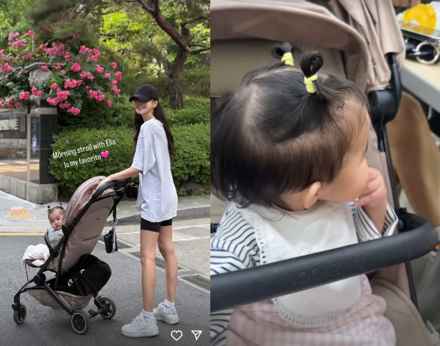 김윤지는 27일 딸과의 일상을 담은 사진을 공개하고 "엘라와의 아침 산책은 내 최애"라고 적었다.