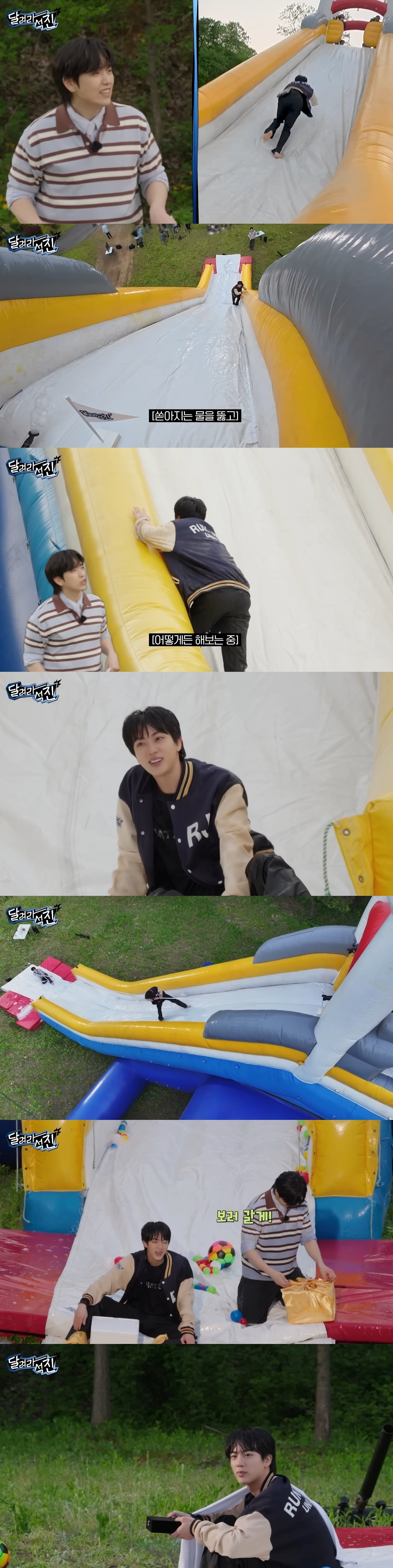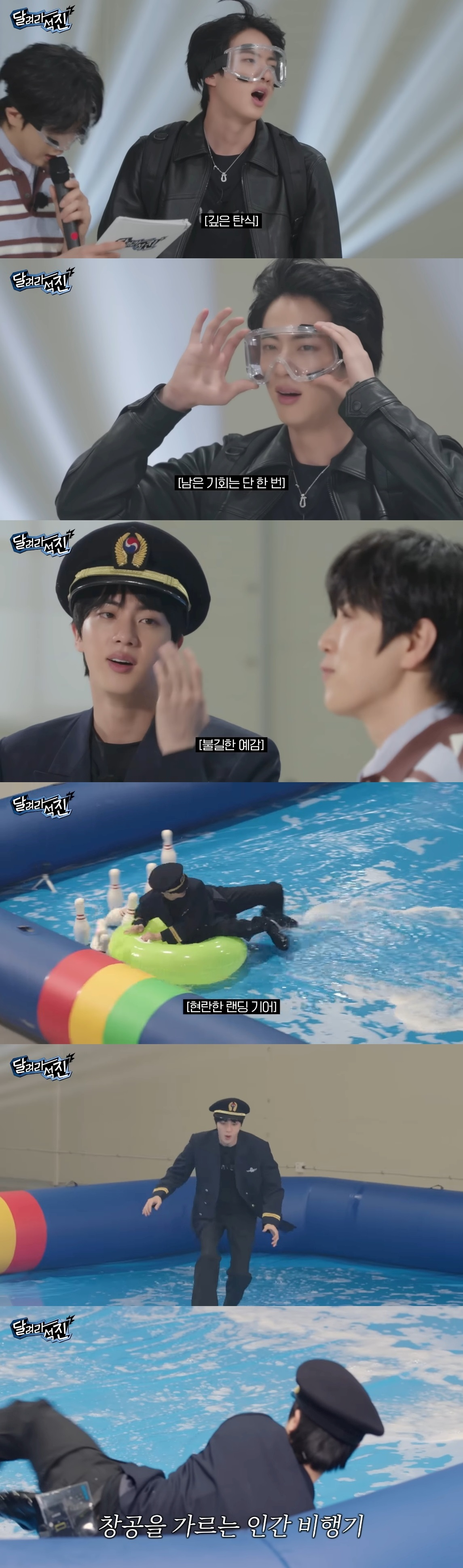 의상을 파일럿으로 바꿔 입은 진은 두 번째로 비눗물 볼링 미션에 도전했다. 튜브를 타고 슬라이딩, 총 7번 시도해 핀을 쓰러뜨린 점수를 합산해 룰렛 추첨 점수를 만들어내면 성공이었다. 전략이 필요한 이 게임에서도 아끼지 않고 몸을 던진 진은 더 어려운 튜브로 계속 바뀌는 와중에도 완벽한 전략으로 미션에 성공, 보는 이들의 감탄을 불러일으켰다.