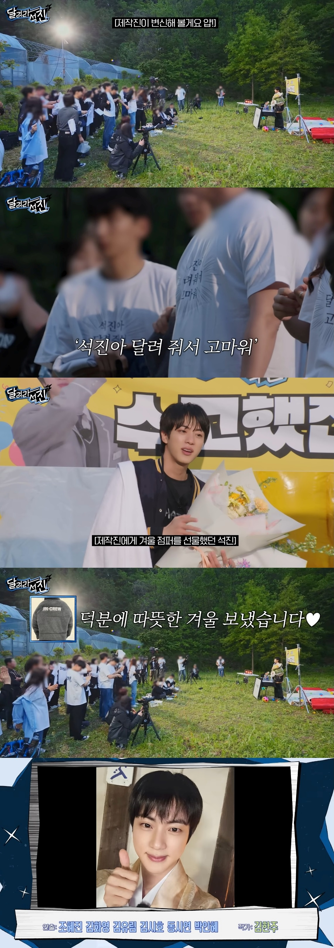 제작진은 마지막으로 재킷을 벗는 깜짝 이벤트로 진을 감동하게 했다. 제작진들이 입은 흰 티셔츠에는 "석진아, 달려줘서 고마워"라고 적혀 있었다. 진은 웃음과 함께 달려라 석진 티셔츠 멋있게 잘 입어줘서 정말 감사하다고 말했다. 진이 제작진에게 겨울 점퍼를 선물했던 미담 또한 밝혀졌다.