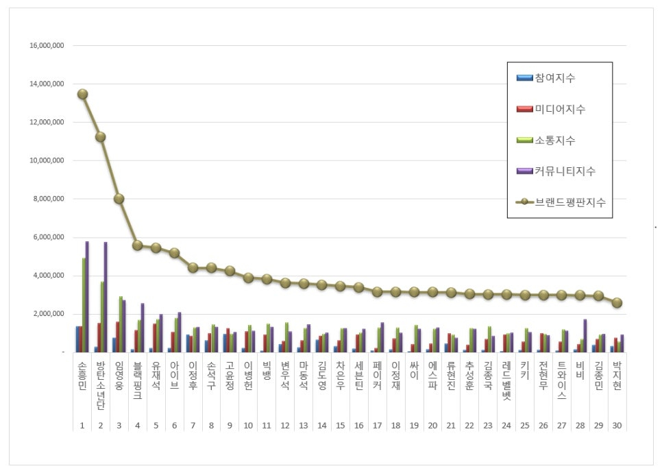 2025년 5월 스타 브랜드평판 30위 순위는 손흥민, 방탄소년단, 임영웅, 블랙핑크, 유재석, 아이브, 이정후, 손석구, 고윤정, 이병헌, 빅뱅, 변우석, 마동석, 김도영, 차은우, 세븐틴, 페이커, 이정재, 싸이, 에스파, 류현진, 추성훈, 김종국, 레드벨벳, 키키, 전현무, 트와이스, 비비, 김종민, 박지현 순으로 분석됐다.