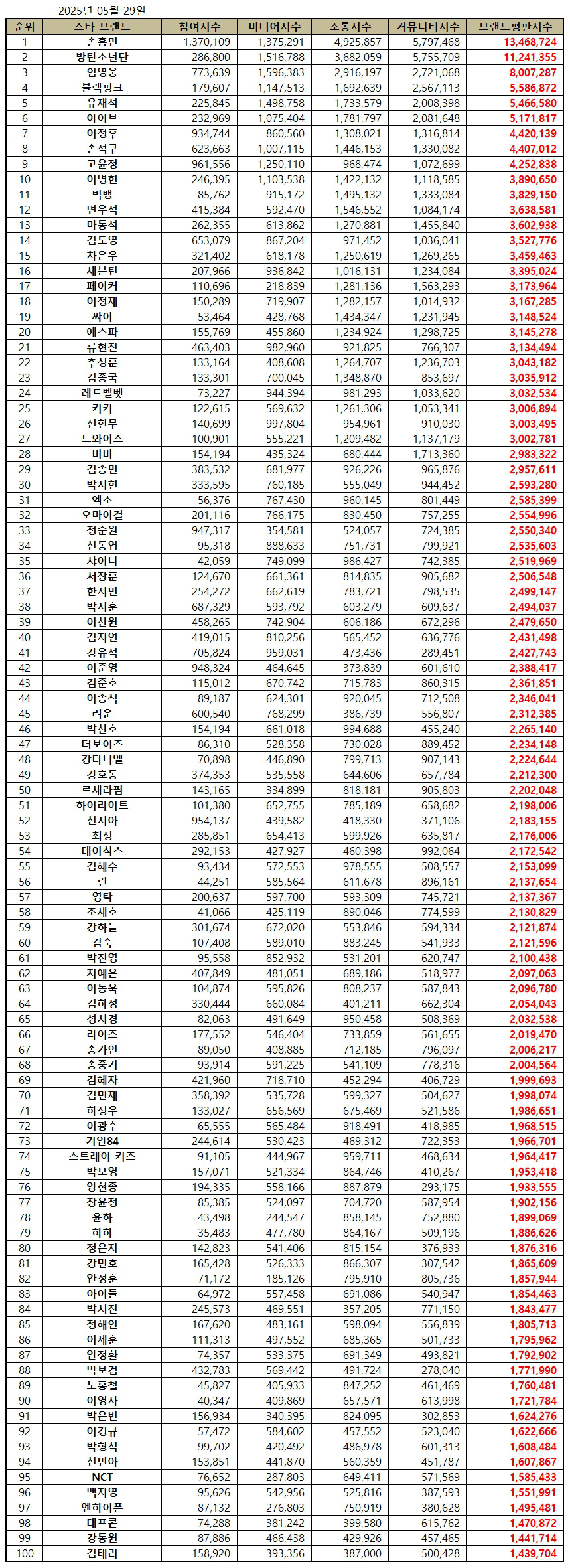 스타 브랜드평판 2025년 5월 빅데이터 분석 100위는 손흥민, 방탄소년단, 임영웅, 블랙핑크, 유재석, 아이브, 이정후, 손석구, 고윤정, 이병헌, 빅뱅, 변우석, 마동석, 김도영, 차은우, 세븐틴, 페이커, 이정재, 싸이, 에스파, 류현진, 추성훈, 김종국, 레드벨벳, 키키, 전현무, 트와이스, 비비, 김종민, 박지현, 엑소, 오마이걸, 정준원, 신동엽, 샤이니, 서장훈, 한지민, 박지훈, 이찬원, 김지연, 강유석, 이준영, 김준호, 이종석, 려운, 박찬호, 더보이즈, 강다니엘, 강호동, 르세라핌, 하이라이트, 신시아, 최정, 데이식스, 김혜수, 린, 영탁, 조세호, 강하늘, 김숙, 박진영, 지예은, 이동욱, 김하성, 성시경, 라이즈, 송가인, 송중기, 김혜자, 김민재, 하정우, 이광수, 기안84, 스트레이 키즈, 박보영, 양현종, 장윤정, 윤하, 하하, 정은지, 강민호, 안성훈, 아이들, 박서진, 정해인, 이제훈, 안정환, 박보검, 노홍철, 이영자, 박은빈, 이경규, 박형식, 신민아, NCT, 백지영, 엔하이픈, 데프콘, 강동원, 김태리 순으로 분석됐다.