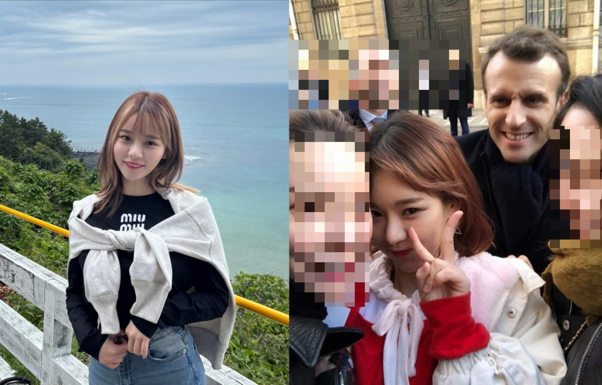 공개된 사진 속 맹승지는 지인들과 프랑스 여행을 하다 우연히 만난 마크롱 프랑스 대통령과 셀카를 찍고 있다.