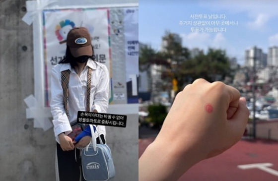 특히 지난 29일 그룹 에스파 카리나가 빨간색에 숫자 2가 적힌 옷을 입고 근황 사진을 올렸다가 빈지노에 앞서 정치색 논란이 크게 불거진 바. 이를 의식한 연예인들은 사전투표 당일 색깔 없는 심플한 사진으로 논란을 사전 차단한 '슬기로운 인증샷'에 신경쓴 모습이었다.