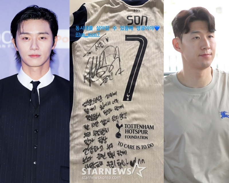 30일 박서준은 개인 SNS에 "동시대를 살아갈 수 있음에 영광이야"라며 손흥민에게 받은 사인 유니폼 사진을 게재했다.