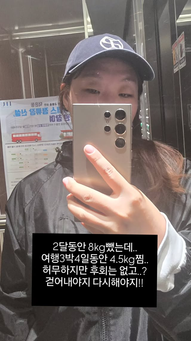 정주리는 30일 자신의 인스타그램에 "두 달 동안 8kg 뺐는데 여행 3박 4일 동안 4.5kg 찜"이라며 사진 한 장을 공개했다.
