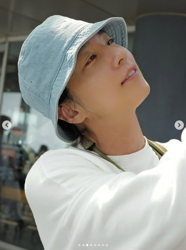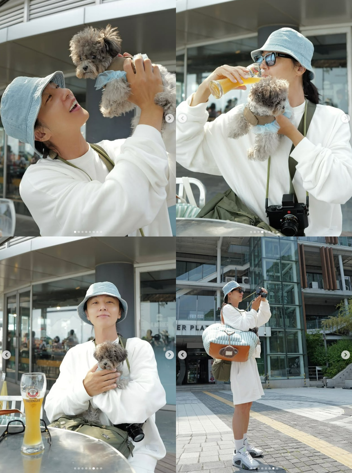 사진 속 신동욱은 장발에 버킷햇을 쓰고 맥주 한 잔을 즐기고 있는 모습. 반려견을 품에 안고 행복한 미소를 지으며 취미인 사진 찍기에 열중인 상태다.
